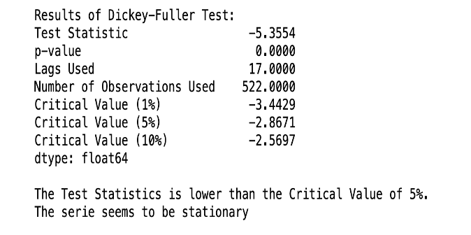3. If the p-value is lower than the critical value (0.05), we reject the Null Hypothesis; otherwise, we accept it. For our datasets, the majority have yielded results indicating rejection of the null hypothesis, implying that the datasets are stationary, as demonstrated below.